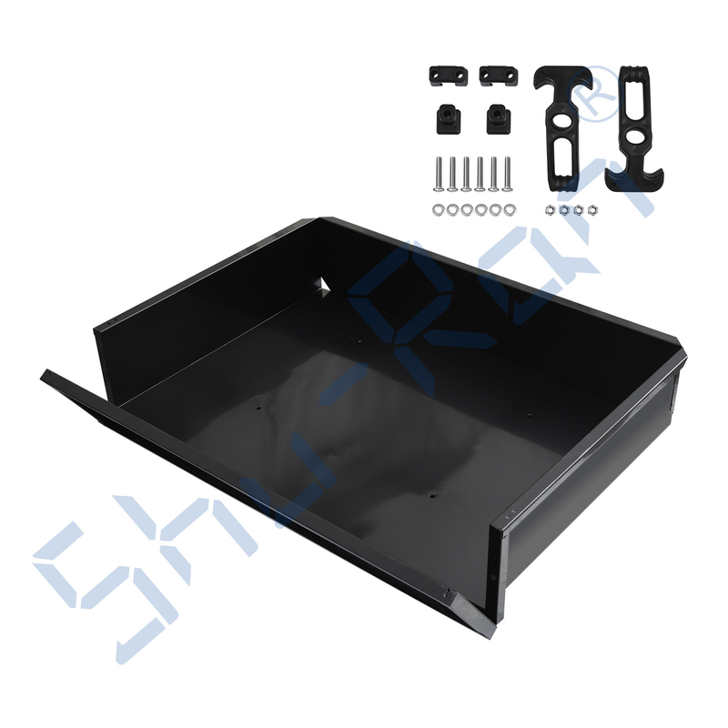 Wytrzymała czarna stalowa skrzynia ładunkowa zamienia wózek golfowy w pojazd użytkowy w stylu OEM. Składana 'klapa tylna' z bezgrzechotkowymi gumowymi zatrzaskami. Całość wykonana z wysokiej jakości stali.